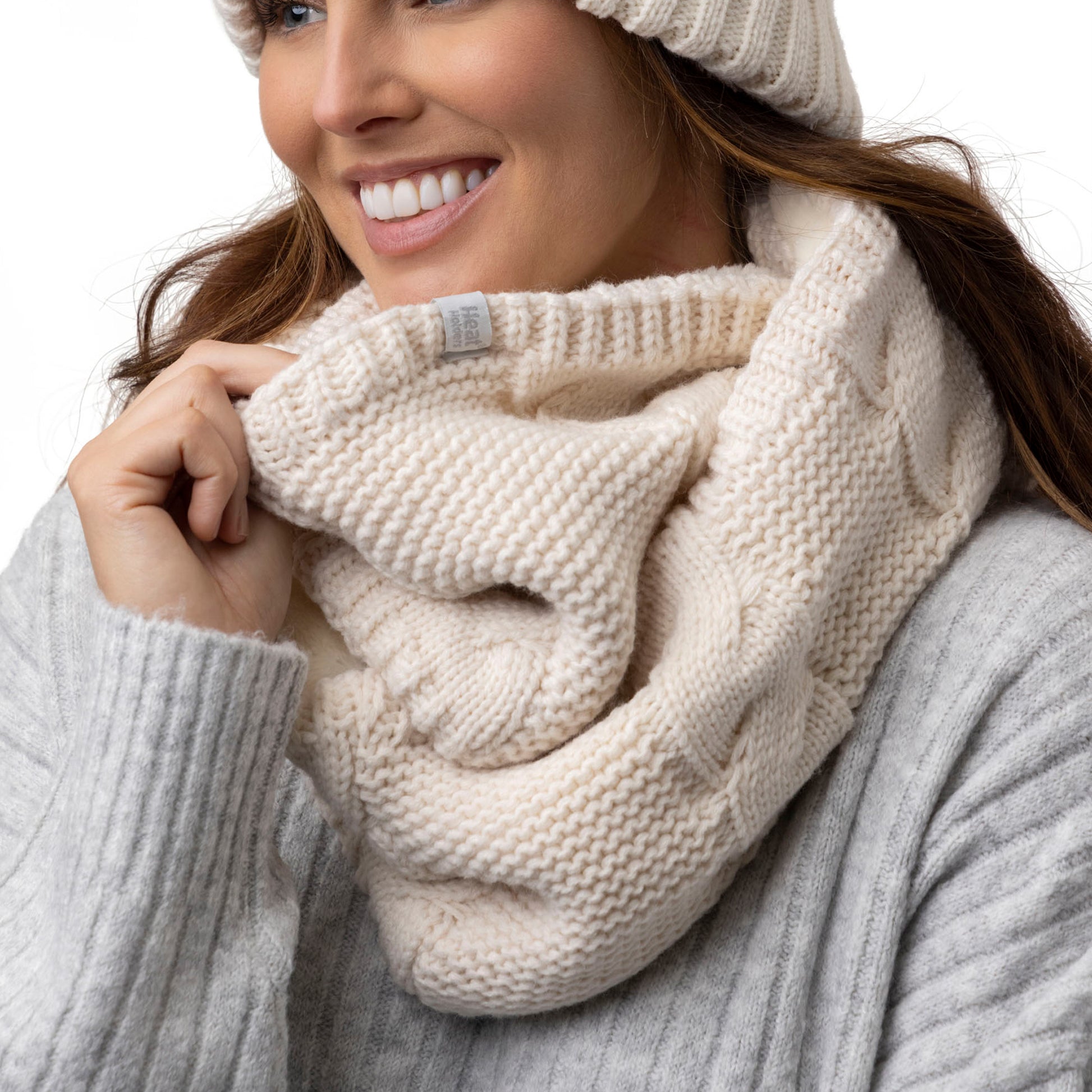 Dieser Damen-Thermoschal Kalma in Cream mit grobem Zopfmuster bietet Ihnen die Wärme und den Komfort von Heat Holders in einem schlichten und praktischen Design. Unsere Thermoschals kombinieren die Schlichtheit unserer Halswärmer mit dem Stil eines klassischen Schals und können je nach Stil gewickelt oder drapiert werden.